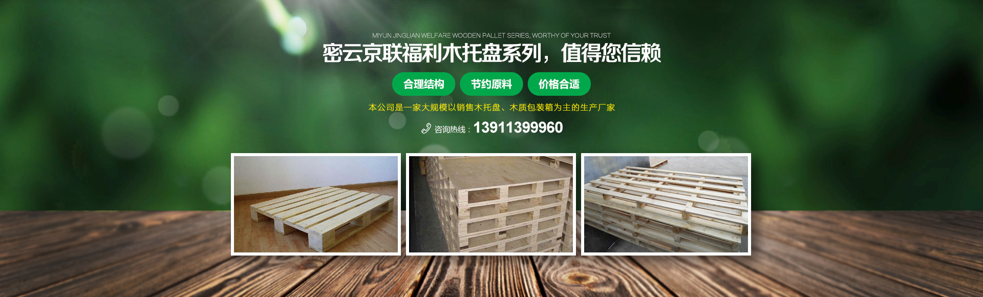 北京京聯國順木制品有限公司 (原北京市密云縣京聯福利木制品廠)成立于1993年,位于北京市密云縣西田各莊鎮蒼頭村,占地約5000平米。我公司工廠是一家大規(guī)模以銷售木托盤為主的生產廠家。本工廠是一家直接采購原木,按客戶要求生產規(guī)格尺寸的托盤,我公司工廠位于河北省承德市有著木材加工點,可以做到,從山上的木頭下山到客戶手中的托盤都是一手貨,減少了中間商的費用,所以我公司售出的產品對北京這個龐大的市場來說在同樣的規(guī)格尺寸的托盤來說價格比較占優(yōu)勢。